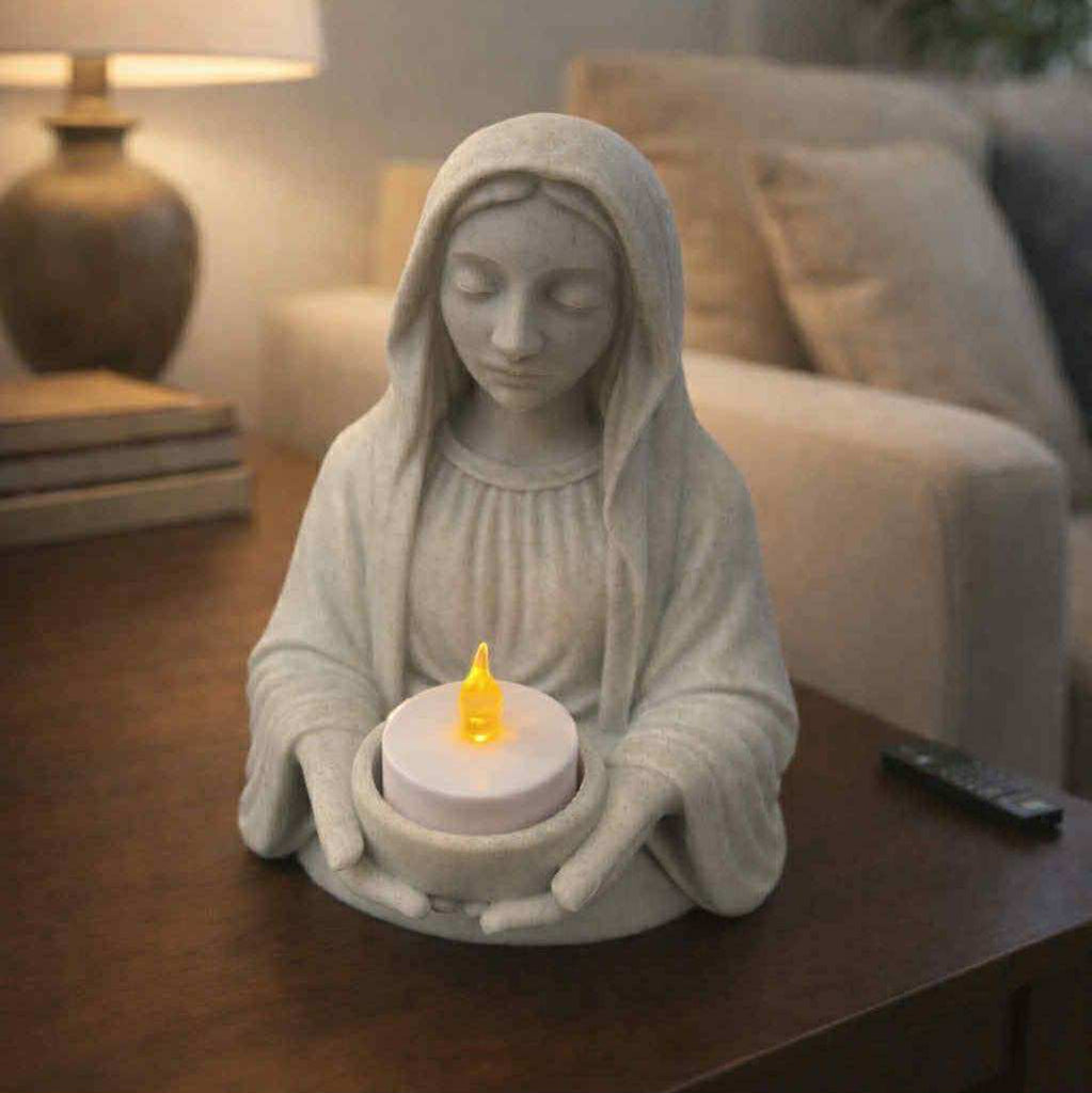 This 3D printed tealight holder features a serene, stone-style figure gently holding a softly flickering LED tealight. Designed to create a peaceful, cosy atmosphere, it looks beautiful on a side table, shelf, or bedside.
